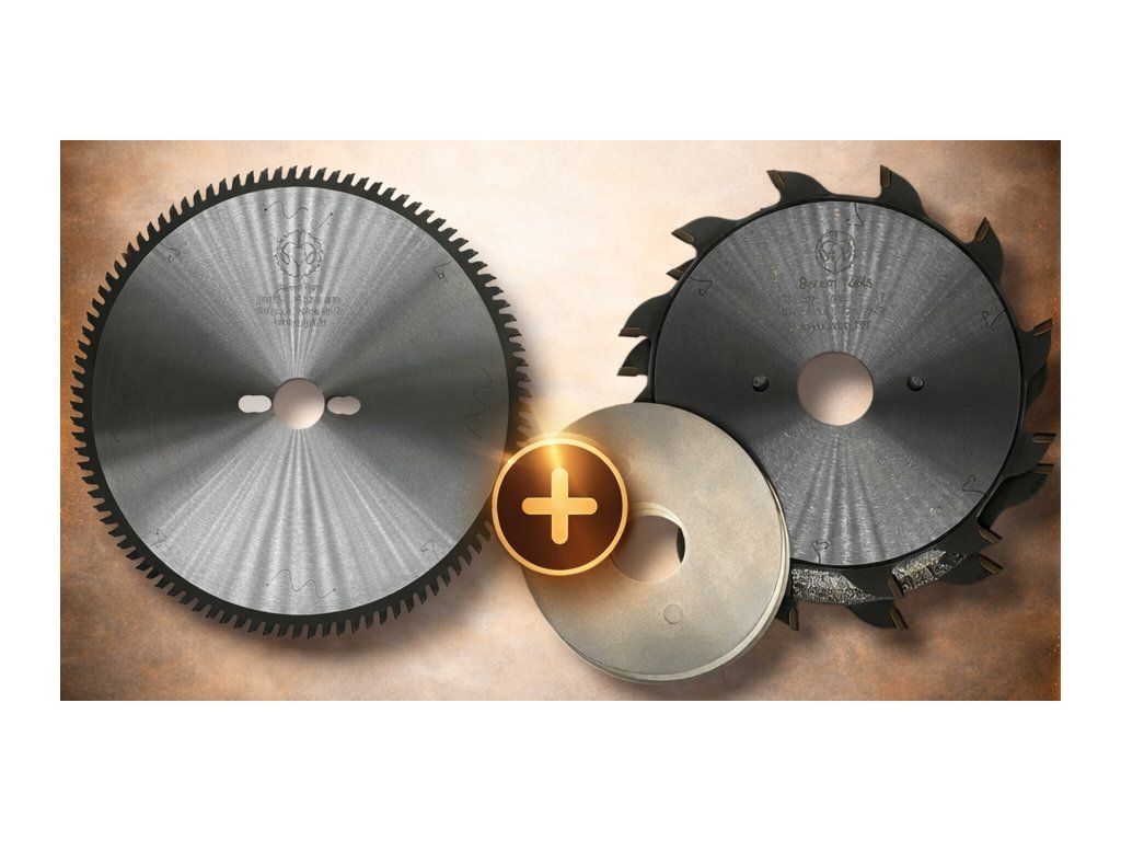 Oba kotouče jsou osazeny PCD (polykrystalickými diamantovými) břity, které výrazně zvyšují odolnost proti opotřebení a zajišťují dlouhodobě stabilní kvalitu řezu i při obrábění abrazivních materiálů, jako jsou laminované desky, MDF nebo dřevotřískové materiály.