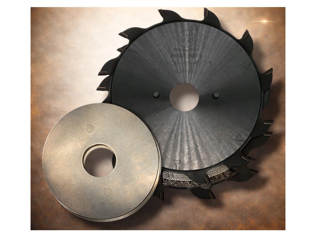 Oba kotouče jsou osazeny PCD (polykrystalickými diamantovými) břity, které výrazně zvyšují odolnost proti opotřebení a zajišťují dlouhodobě stabilní kvalitu řezu i při obrábění abrazivních materiálů, jako jsou laminované desky, MDF nebo dřevotřískové materiály.